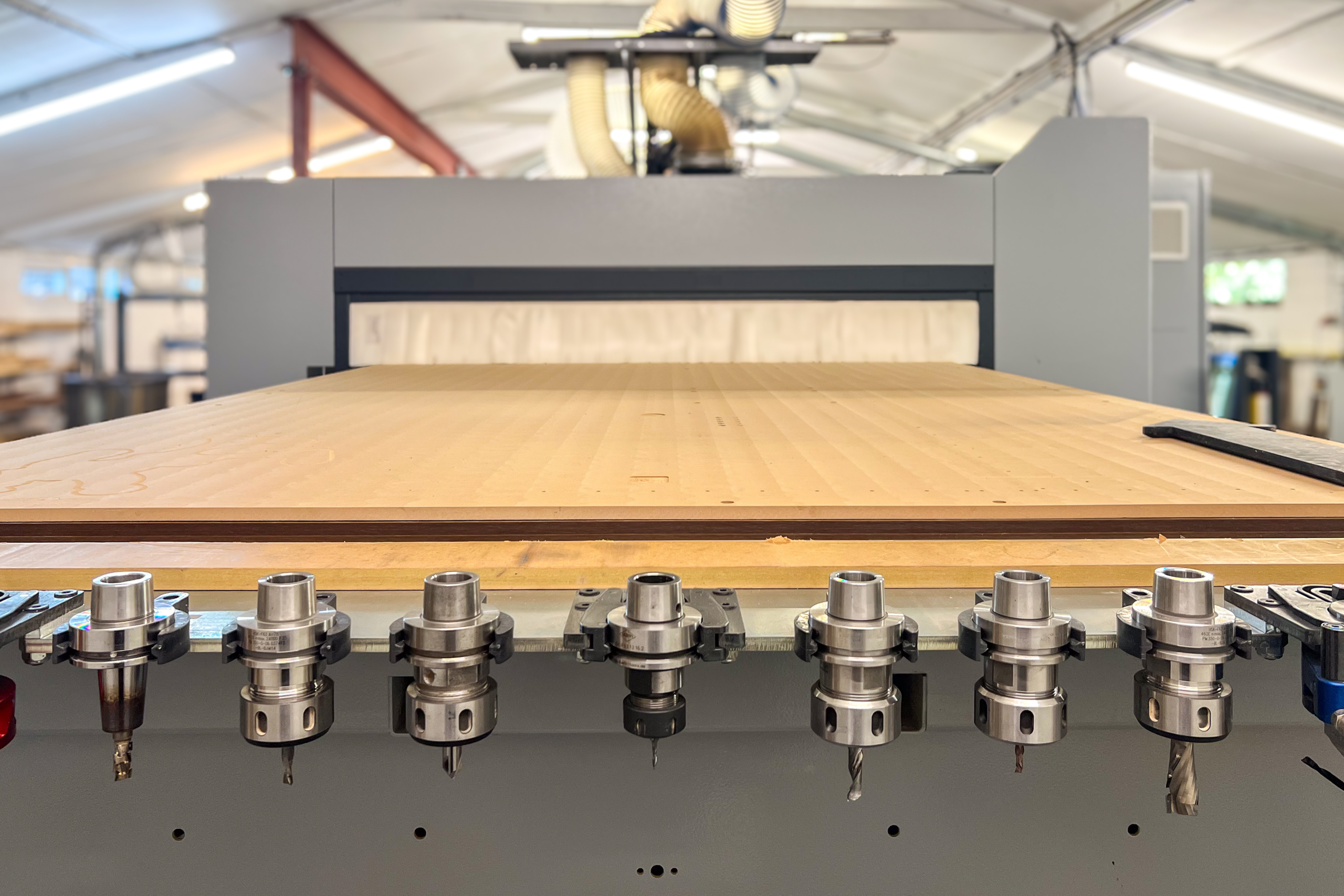 Our CNC machine has a 15 position tool holder meaning it can physically hold up to 15 different cutting tools at once. The CNC also has a vertical drilling aggregate with 12 spindles and a horizontal drilling aggregate with 4 spindles; 2 groove saws. Our machine also has a 4th Axis (known as the C Axis) with a low level aggregate meaning we can cut pocket holes with ease on the CNC machine.